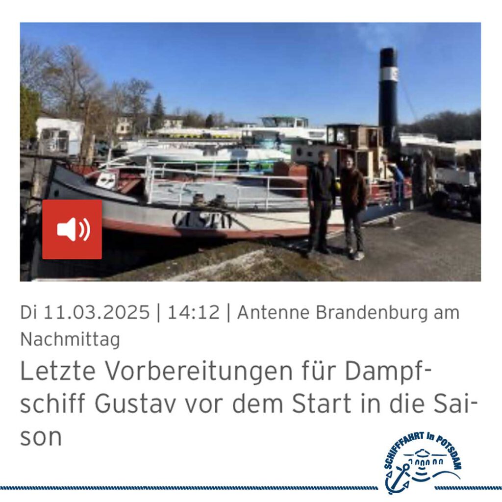 Antenne Brandenburg berichtete gestern von den Neuigkeiten bei der WEISSE FLOTTE Potsdam, den letzten Saisonvorbereitungen, und das Dampfschiff Gustav fährt wieder…